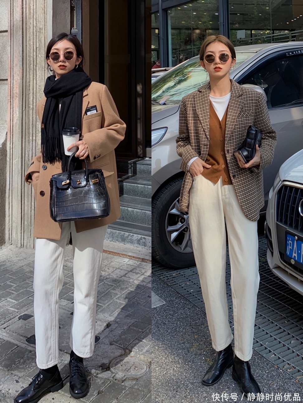 白色直筒裤配上棕色的西装,简约知性又大气,不管是20岁还是50岁都可以尝试这样的造型,一般是不会挑剔年龄的。