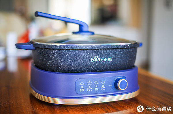 小熊的这口锅从外观上看还是不错的,麦饭石涂层的锅体和蓝色的底座搭配在一起,看着很舒服,底座上还适当的搞了一些金色装饰线条,与时下流行的轻奢风不谋而合。客观地说,小熊家出品的各种小电器,在颜值方面没有不能打的,我家里之前就有一套小熊的早餐机,样子非常可爱,领导大人当年一眼就相中了。